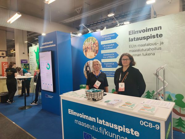Minna Boström kuvassa oikealla ja vieressä ELY-keskuksen kehittämisvastaava Maria Konsin-Palva. Kuva on otettu Kuntamarkkinoilta Maaseuturahoituksen osastolta.